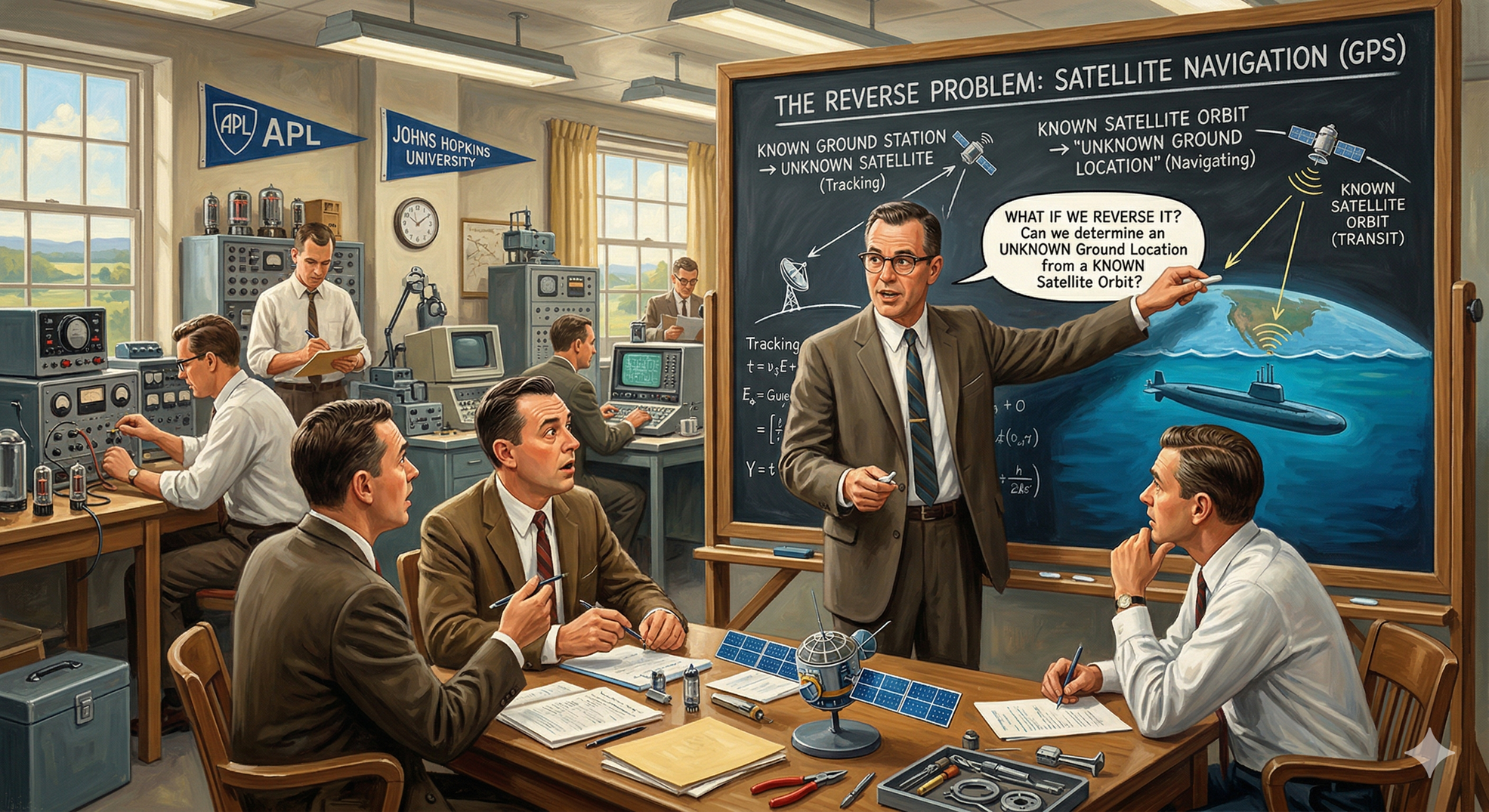この純粋な科学的発見が社会を変えるイノベーションへと昇華したのは、彼らの上司であるフランク・マクルーアによる「問い」がきっかけでした 。彼は「既知の地上地点から未知の衛星を追跡できるなら、その計算を逆転させ、既知の衛星軌道から『地上の未知の現在地』を特定できるのではないか?」と提起したのです 。これがGPSの概念的基盤となる「逆問題(ナビゲーション問題)」の誕生です 。